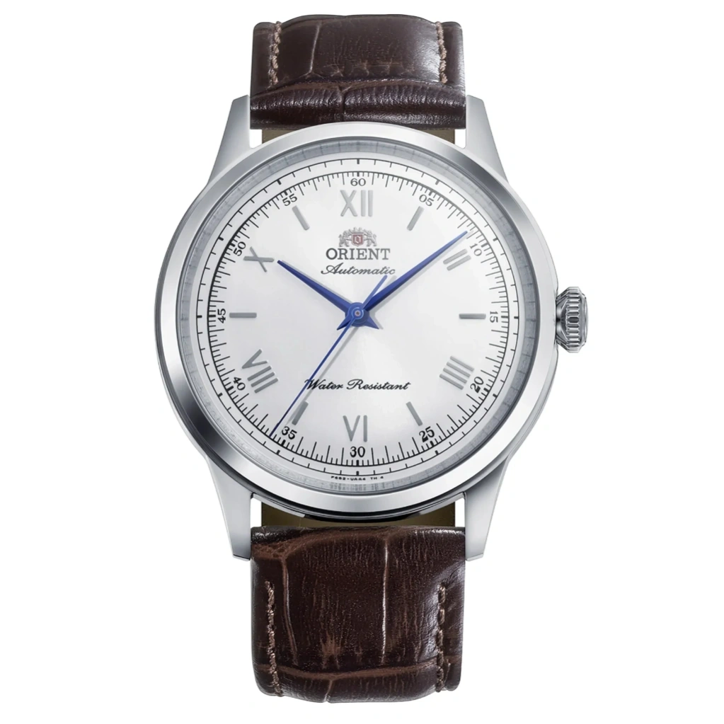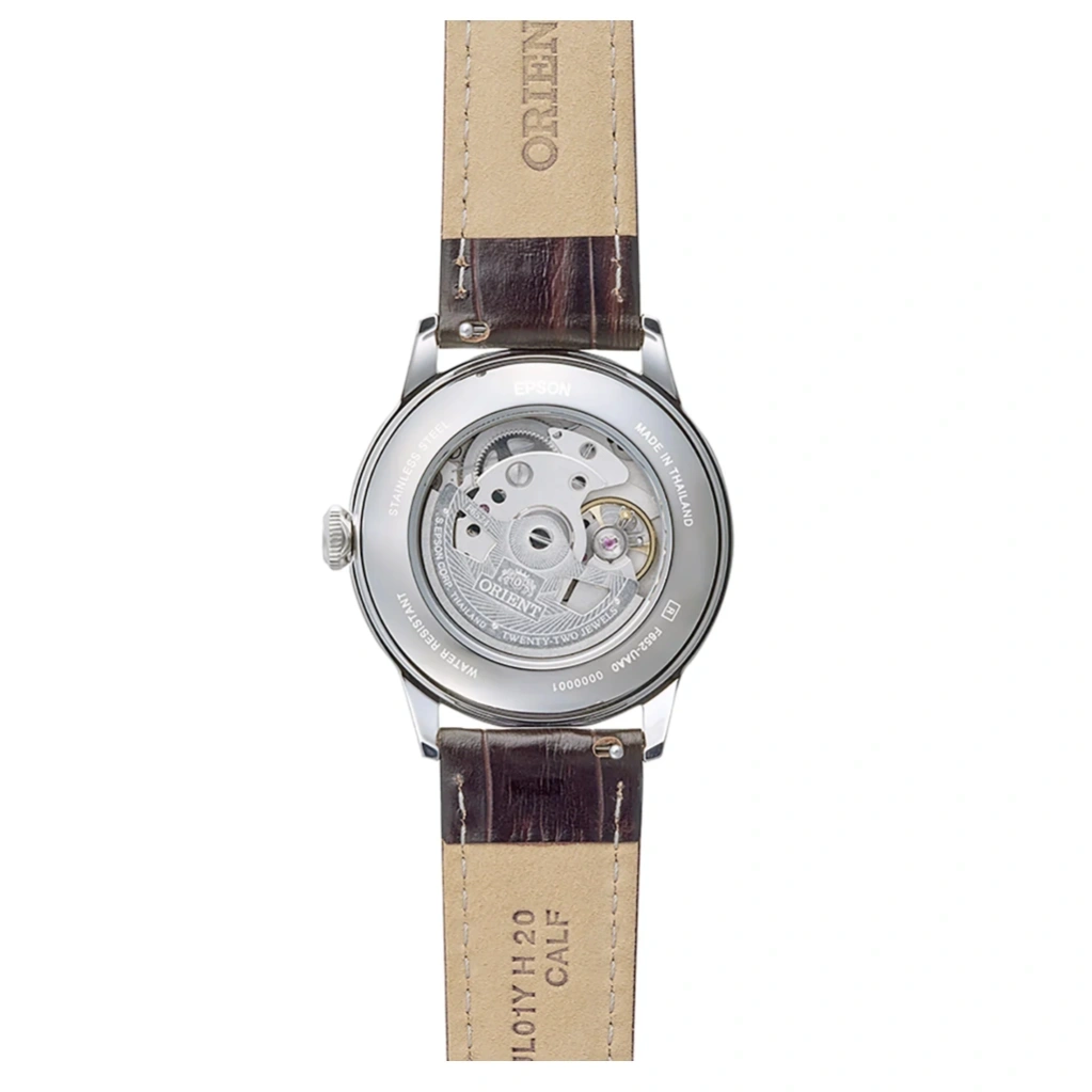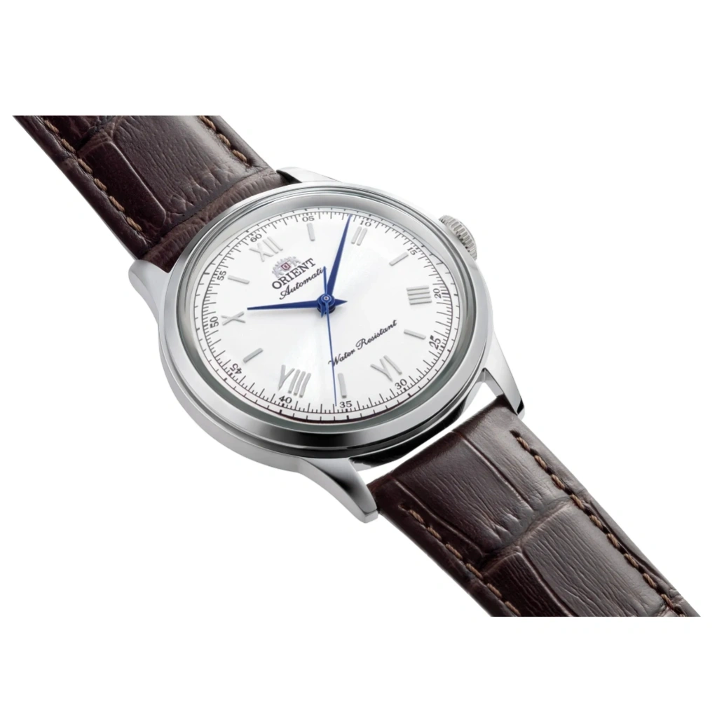 The Orient Bambino RA-BB0002S Classic & Simple Style 38 showcases a clean white dial and a timeless dress watch profile. Its 38.4mm stainless steel case paired with a brown leather strap creates a sophisticated and versatile look suitable for both formal and casual occasions. The see-through exhibition case back allows a view of the watch’s mechanical movement, highlighting its craftsmanship.